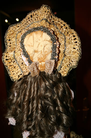 shoes. Hand knit socks. Her hat is made of crocheted straw, velvet